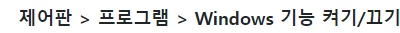 CPU가 가상화를 지원한다면 윈도우 기능을 활성화해주시면 설치 준비는 모두 끝나게 됩니다. 제어판>프로그램>Windows 기능 켜기/끄기를 통해 설정하거나, 윈도우 검색창에서 Windows 기능 켜기/끄기를 검색해 바로 들어가실 수 있습니다.