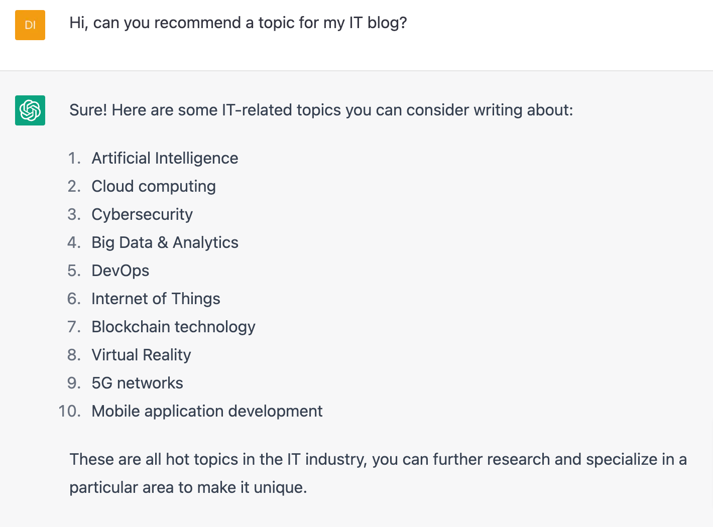 저의 경우 IT블로그를 운영하고있는만큼, IT와 관련된 주제를 추천해달라고 해보았습니다. 인공지능부터, 클라우드컴퓨팅같은 큰 주제에 대해서 추천을 받을수 있네요. 이미 다른 세부적인 주제가 정해졌다면 바로 글을 써달라고 해주시면 됩니다!